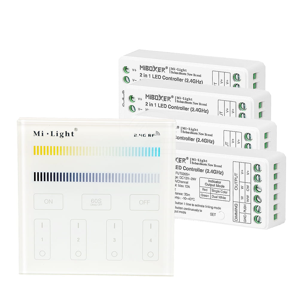 Produkty MiBoxer mogą być dostosowane do różnych rodzajów oświetlenia. Można skorzystać z nich w przypadku diod jednokolorowych, a także wielokolorowych o standardach RGB, RBW czy RGBCCT. To także dobry wybór do lamp ze zmienną temperaturą barwową. Sterownik obsłuży przystosowane żarówki, taśmy LED czy panele naścienne.