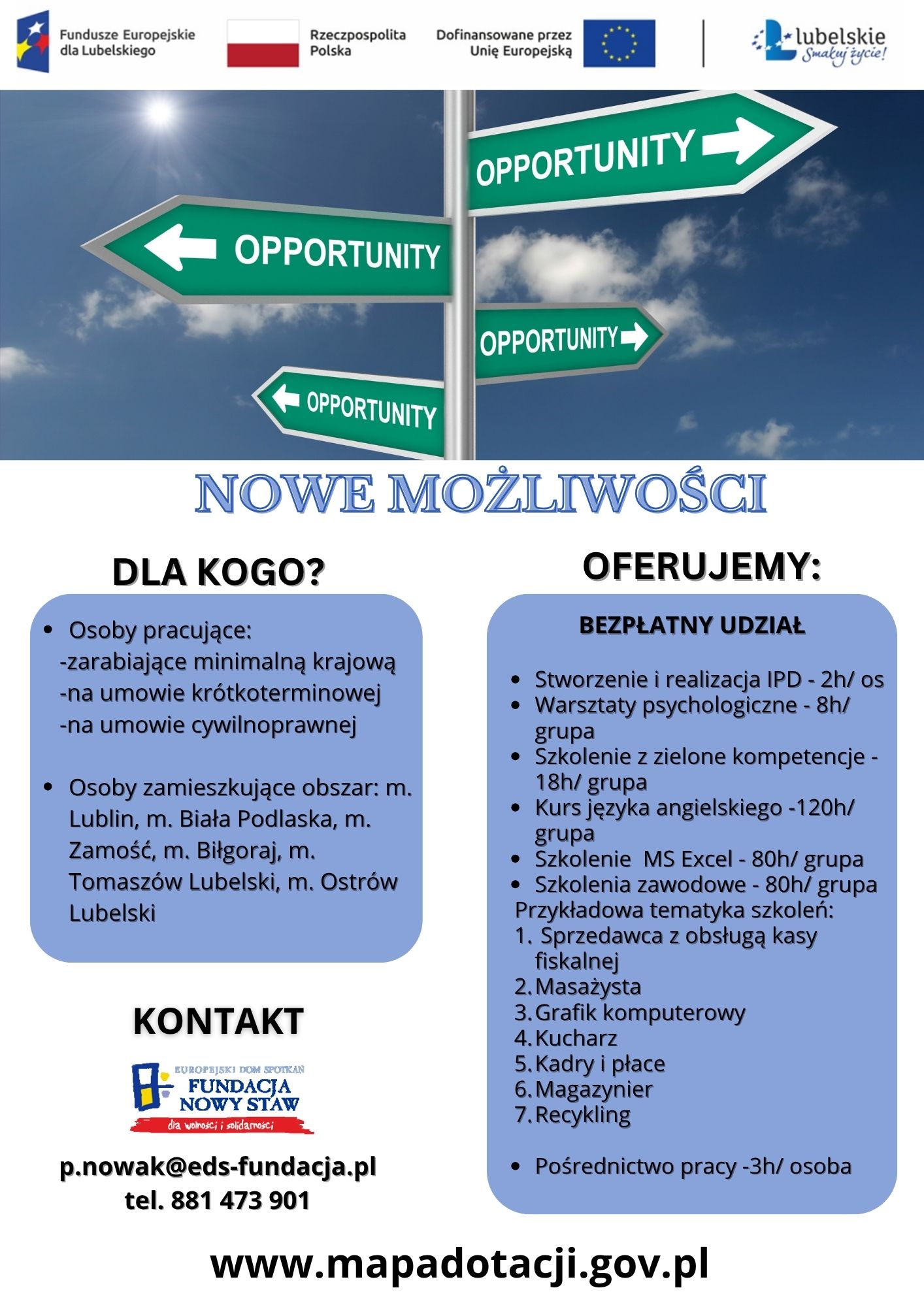 Nowy projekt dla mieszkańców Lubelszczyzny już ruszył! Europejski Dom Spotkań – Fundacja Nowy Staw zaprasza do udziału w inicjatywie „Nowe możliwości”, współfinansowanej z Europejskiego Funduszu Społecznego Plus w ramach programu Fundusze Europejskie dla Lubelskiego 2021–2027. To szansa na zdobycie nowych umiejętności, rozwój zawodowy oraz realną zmianę swojej sytuacji na rynku pracy.