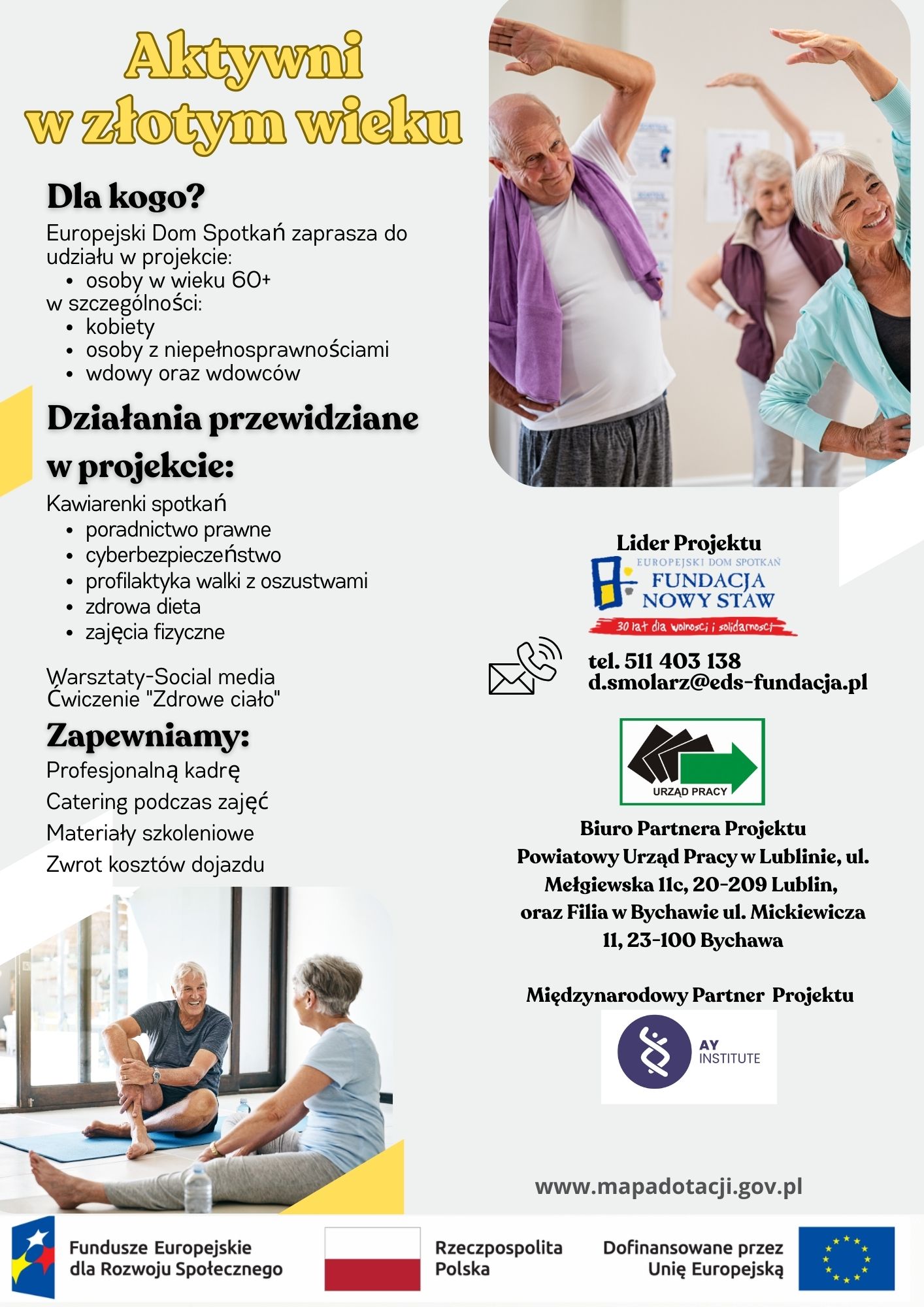 Projektu pod nazwą „Aktywni w złotym wieku”, skierowany jest do osób w wieku 60+, w szczególności do kobiet, osób z niepełnosprawnością, wdów oraz wdowców, zamieszkujących na terenie powiatu lubelskiego.