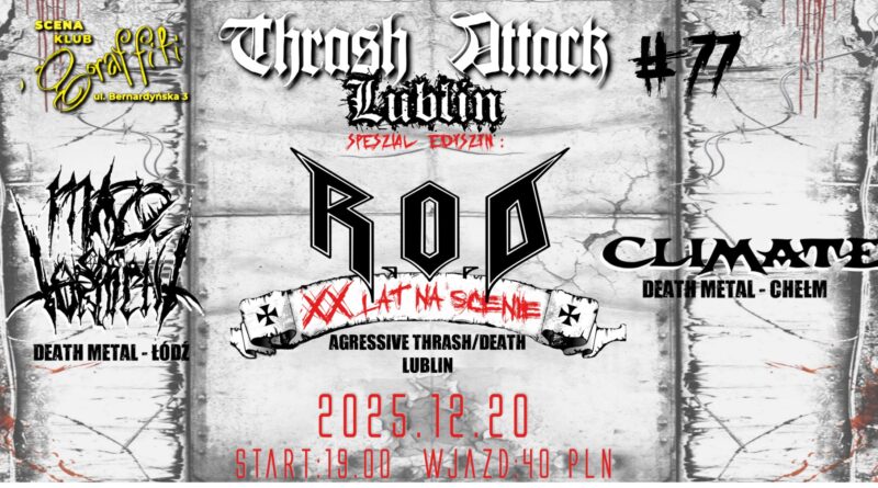 Lubelski zespół R.O.D – jeden z filarów lokalnej sceny thrash/death metalowej – zaprasza na wyjątkową odsłonę cyklu Thrash Attack. Wydarzenie będzie jednocześnie koncertowym świętowaniem 20-lecia obecności zespołu na scenie, co czyni tę edycję szczególną zarówno dla fanów formacji, jak i miłośników ciężkich, bezkompromisowych dźwięków.