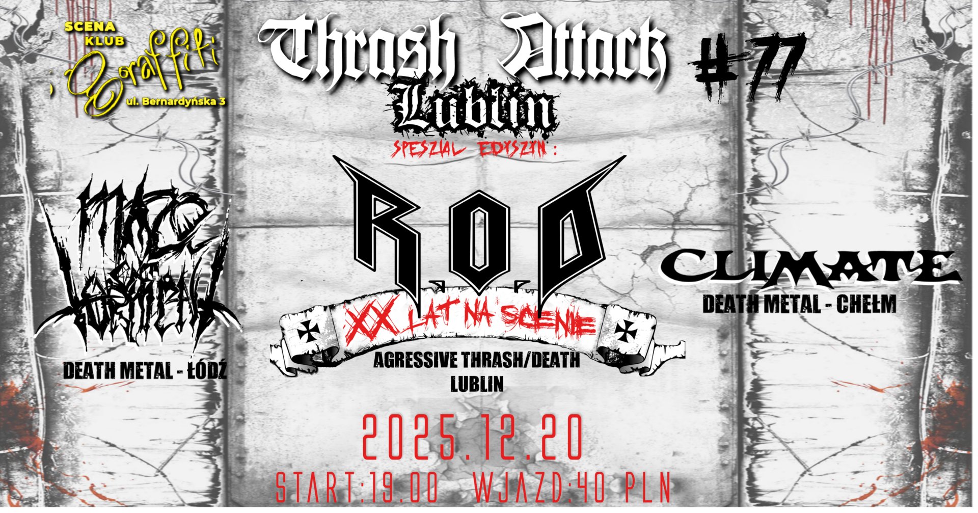 Lubelski zespół R.O.D – jeden z filarów lokalnej sceny thrash/death metalowej – zaprasza na wyjątkową odsłonę cyklu Thrash Attack. Wydarzenie będzie jednocześnie koncertowym świętowaniem 20-lecia obecności zespołu na scenie, co czyni tę edycję szczególną zarówno dla fanów formacji, jak i miłośników ciężkich, bezkompromisowych dźwięków.