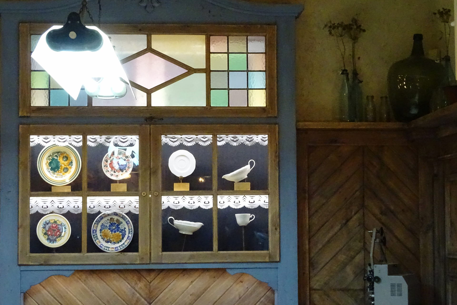 Pracownia zachwyca detalami. Wnętrze pełne jest pomysłowych rozwiązań: umywalki z emaliowanych miednic, abażury z sit, taborety obszyte jutowymi workami. Uwagę przyciąga też stary kredens z wystawą ręcznie malowanych talerzy oraz białych ceramicznych naczyń. Całość dopełniają suszone kwiaty, słoje i gliniane dzbany, które wprowadzają ciepły, rustykalny klimat.