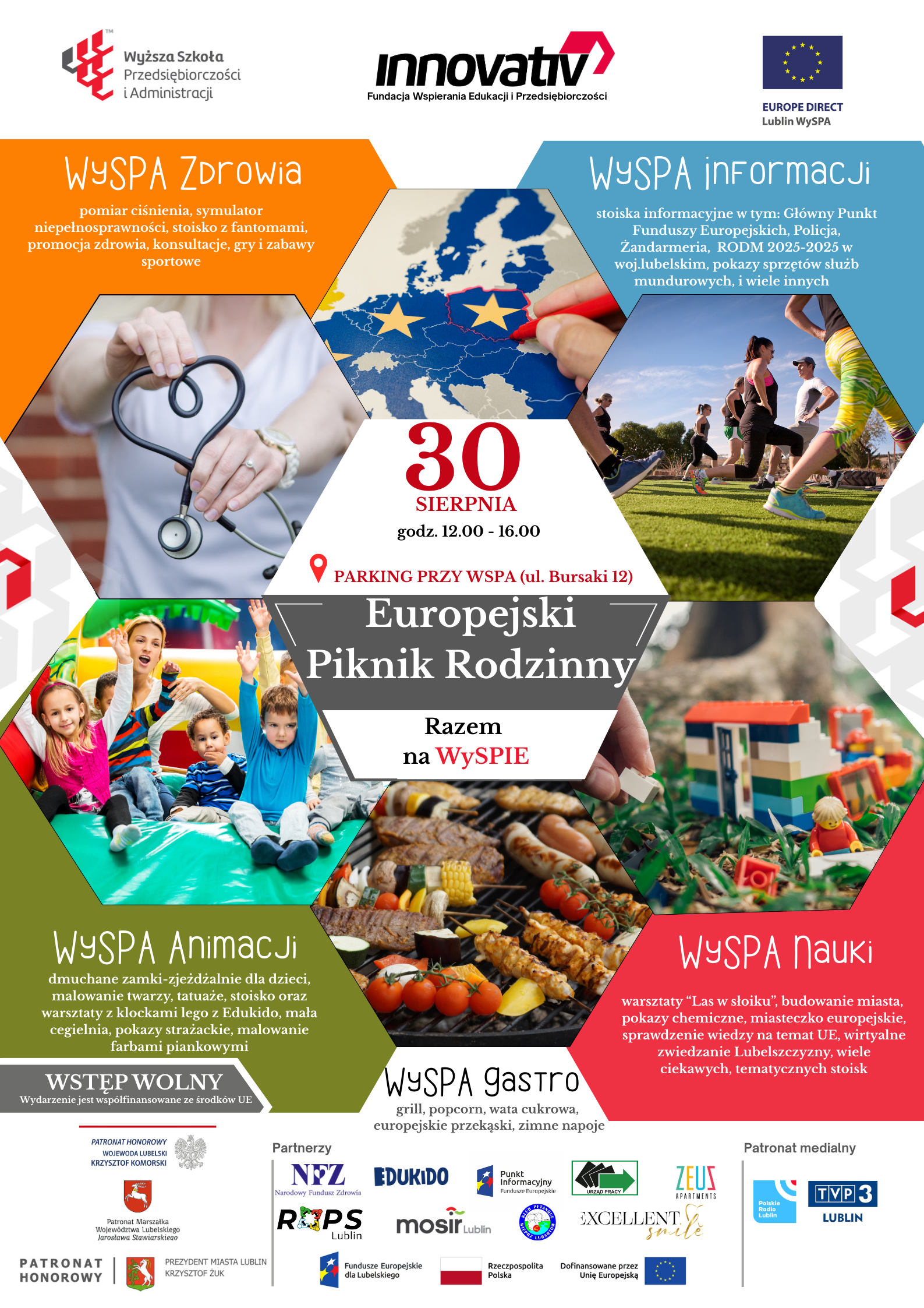W sobotę, 30 sierpnia, na parkingu Wyższej Szkoły Przedsiębiorczości i Administracji w Lublinie przy ul. Bursaki 12 odbędzie się Europejski Piknik Rodzinny „Razem na WySPIE”. Wydarzenie potrwa od godziny 12:00 do 16:00 i będzie bezpłatne dla wszystkich uczestników.