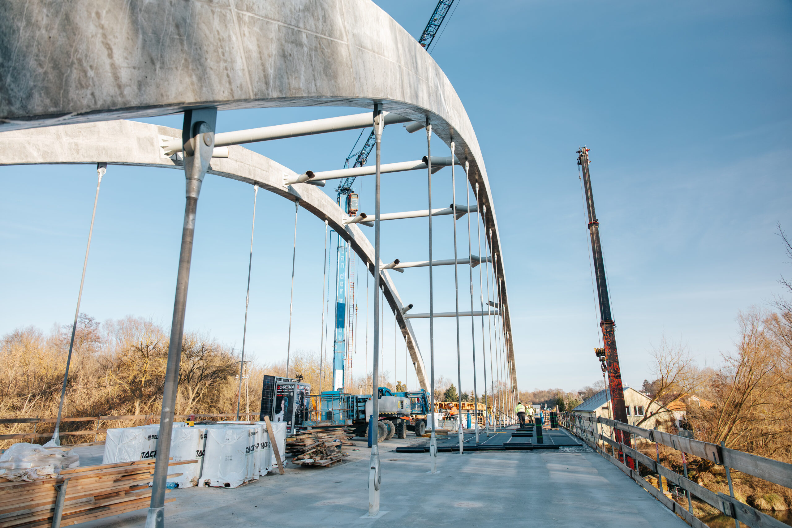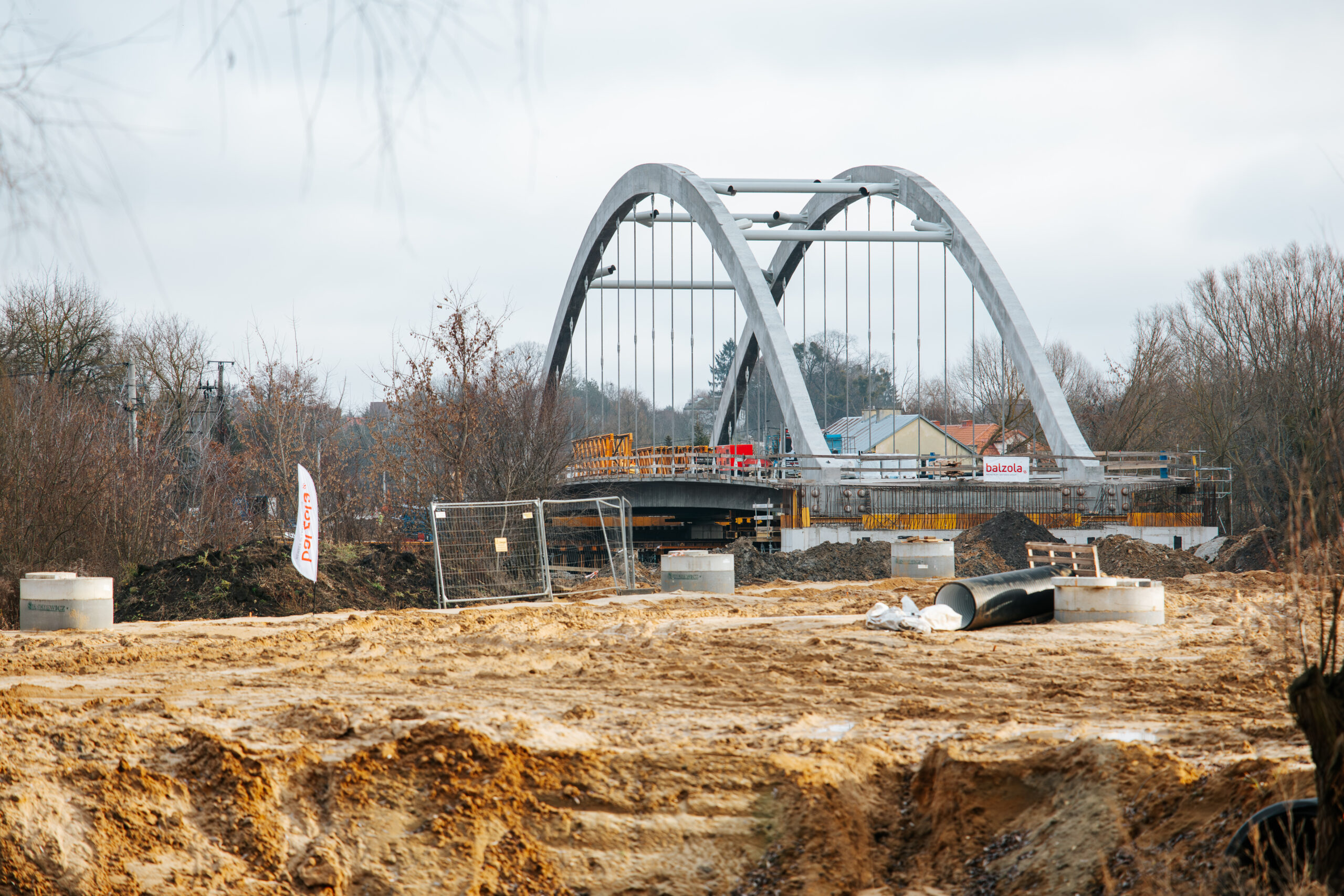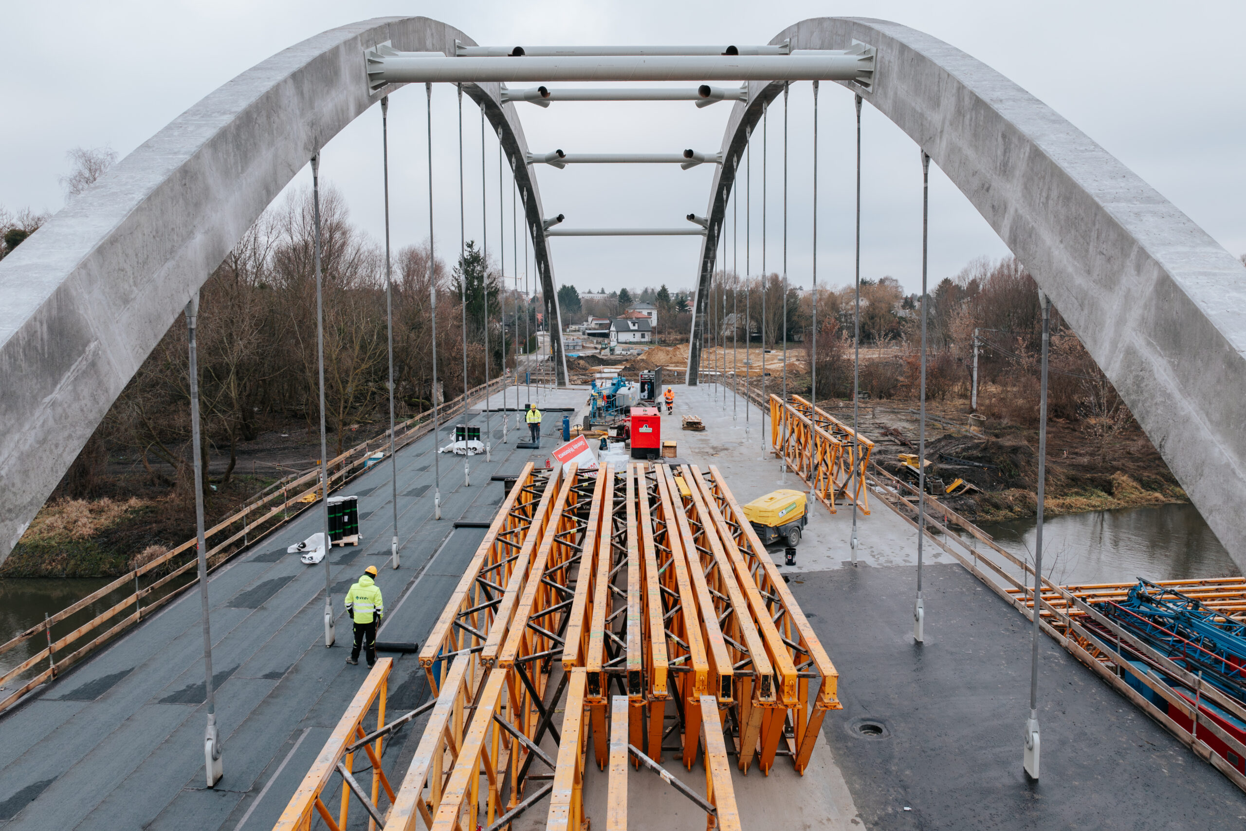 Inwestycja podzielona jest na trzy zadania. W ramach pierwszego, obejmującego budowę samego mostu oraz dróg dojazdowych i ul. Gawryłowa, wykonano już m.in. pale, fundamenty, przyczółki, płytę mostu, elementy sprężające, łuki oraz stężenia. Postęp prac widać także na samej ulicy – zrealizowano roboty brukarskie, stabilizację cementem i podbudowy z kruszywa.