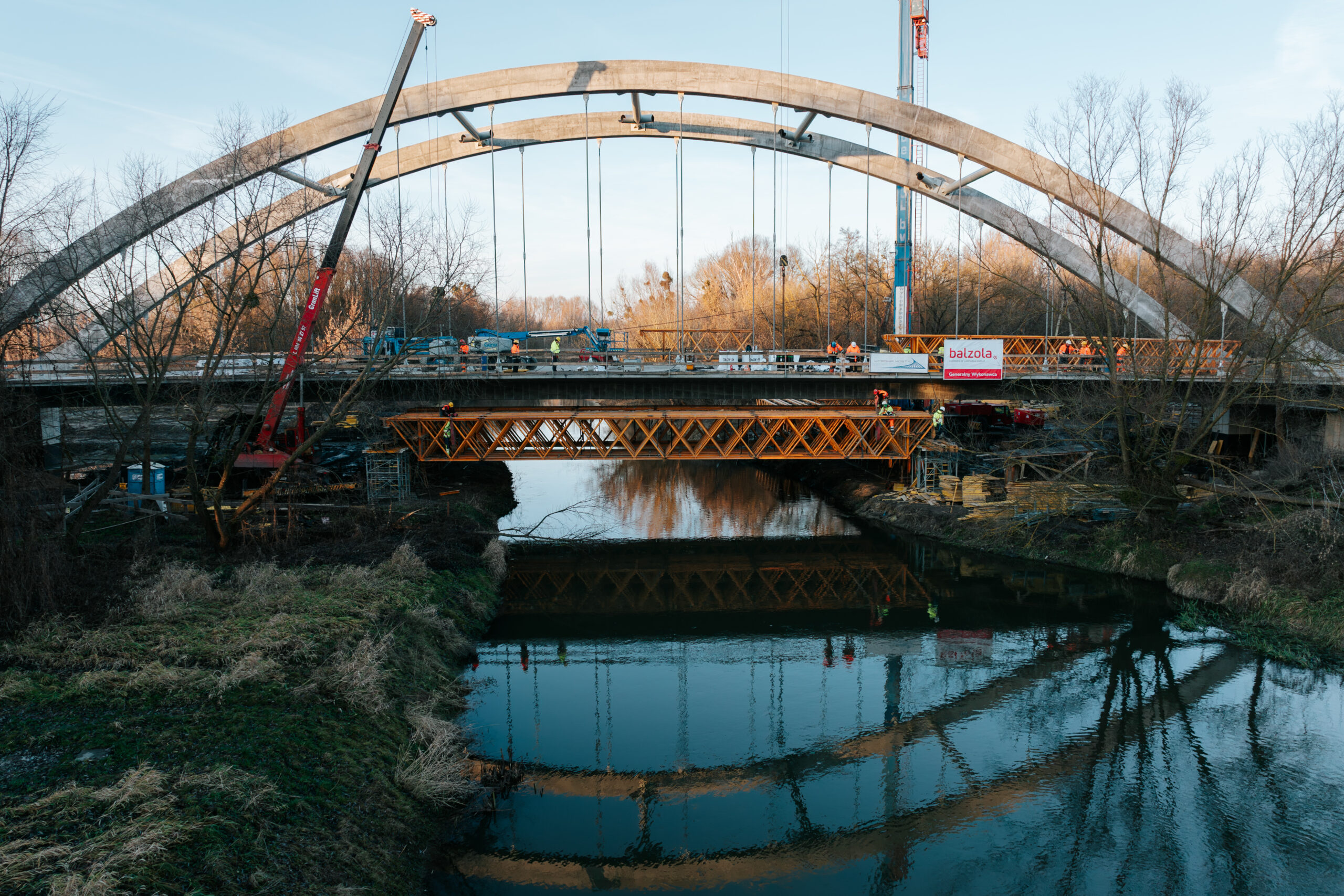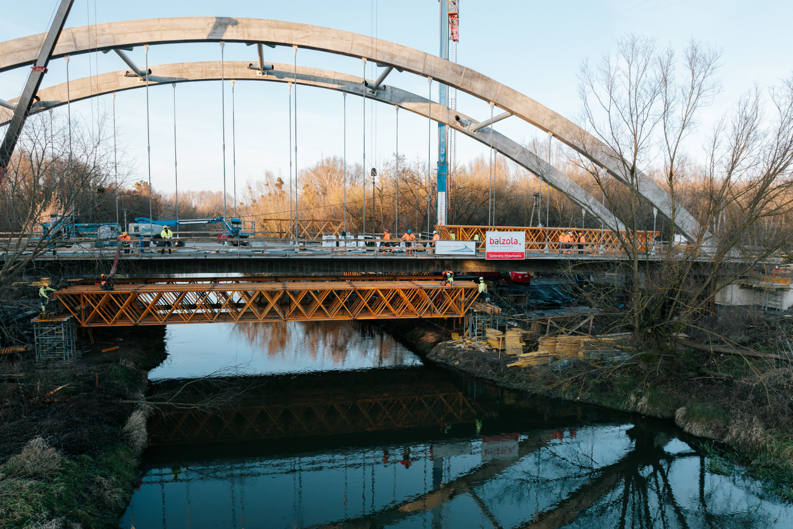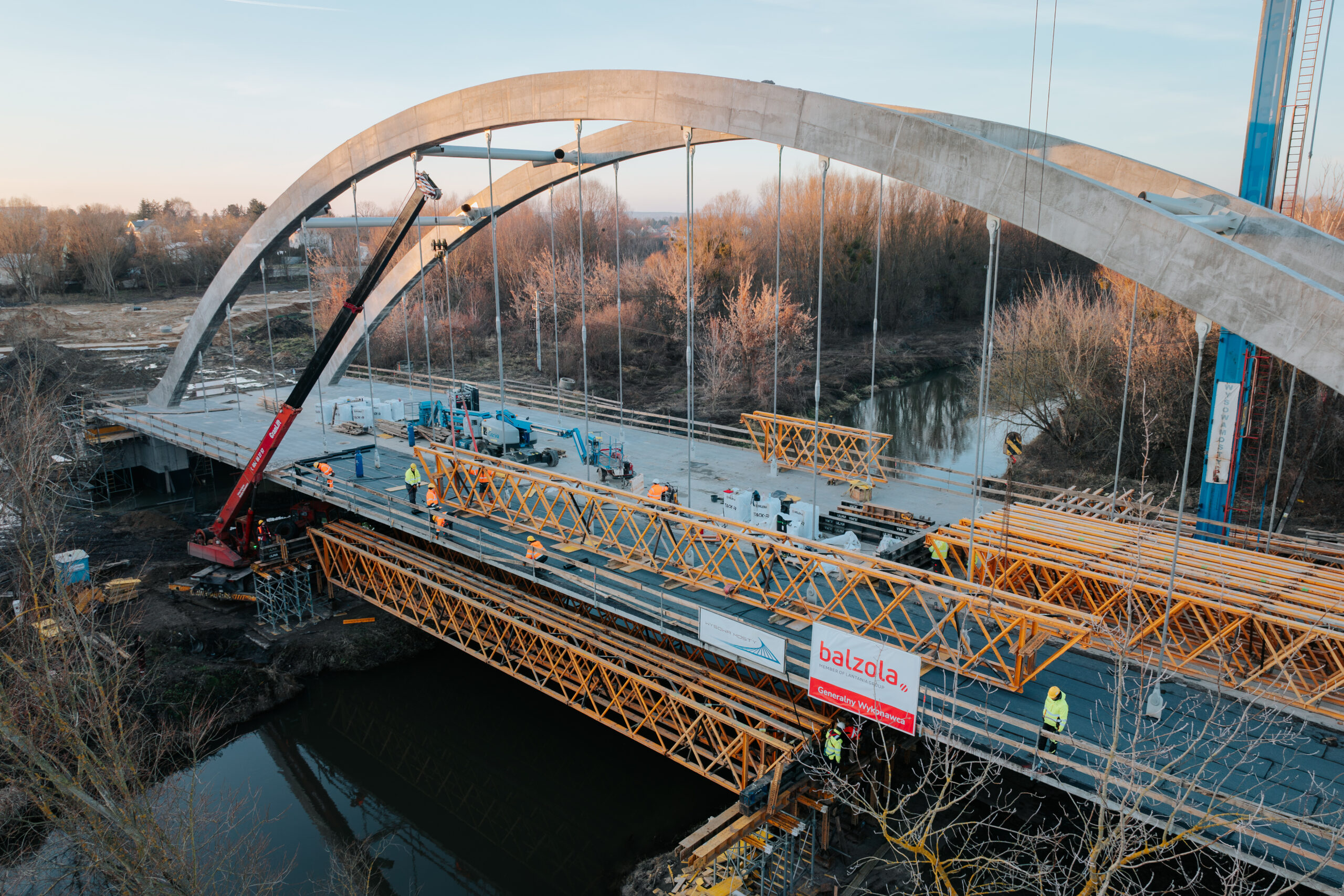 Inwestycja podzielona jest na trzy zadania. W ramach pierwszego, obejmującego budowę samego mostu oraz dróg dojazdowych i ul. Gawryłowa, wykonano już m.in. pale, fundamenty, przyczółki, płytę mostu, elementy sprężające, łuki oraz stężenia. Postęp prac widać także na samej ulicy – zrealizowano roboty brukarskie, stabilizację cementem i podbudowy z kruszywa.