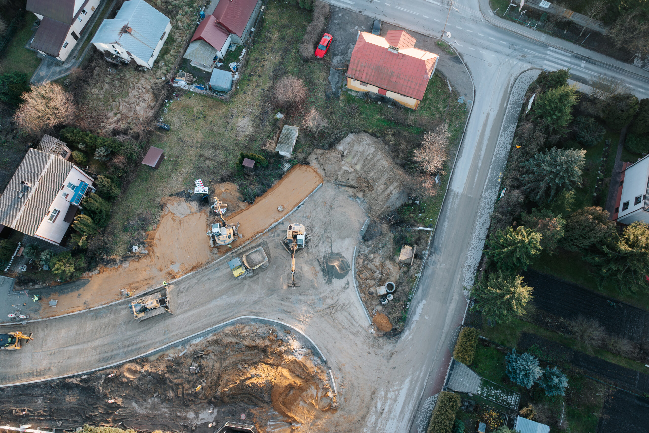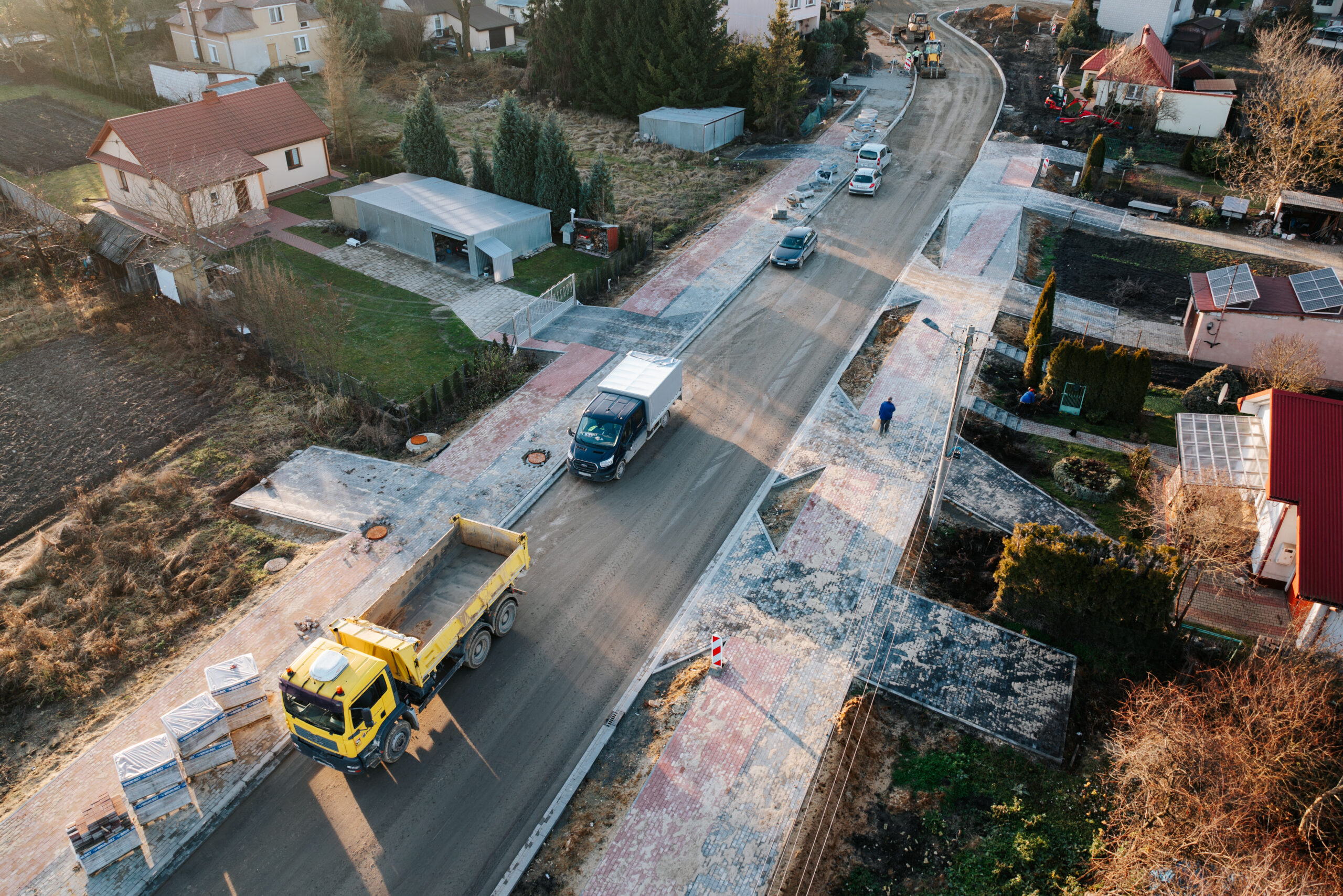 Zadanie numer dwa to przebudowa i budowa ul. Kaczej. Tu prace rozpoczęły się od rozbiórek, wycinki drzew i wymiany gruntu, a następnie przeszły w etap nasypów, stabilizacji i układania warstw bitumicznych. Powstała również nowa infrastruktura podziemna, w tym kanalizacja deszczowa, sieci wodociągowe i oświetlenie uliczne.
